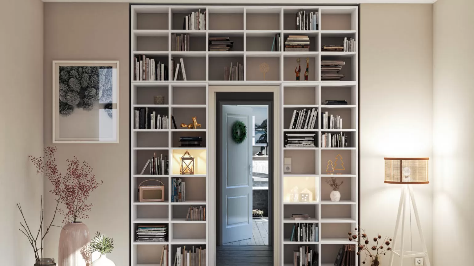 Für dieses deckenhohe Regal wurde ein zusätzliche Aufsatzregal konfiguriert. So ist die Regalwand über die gesamte Höhe nutzbar.