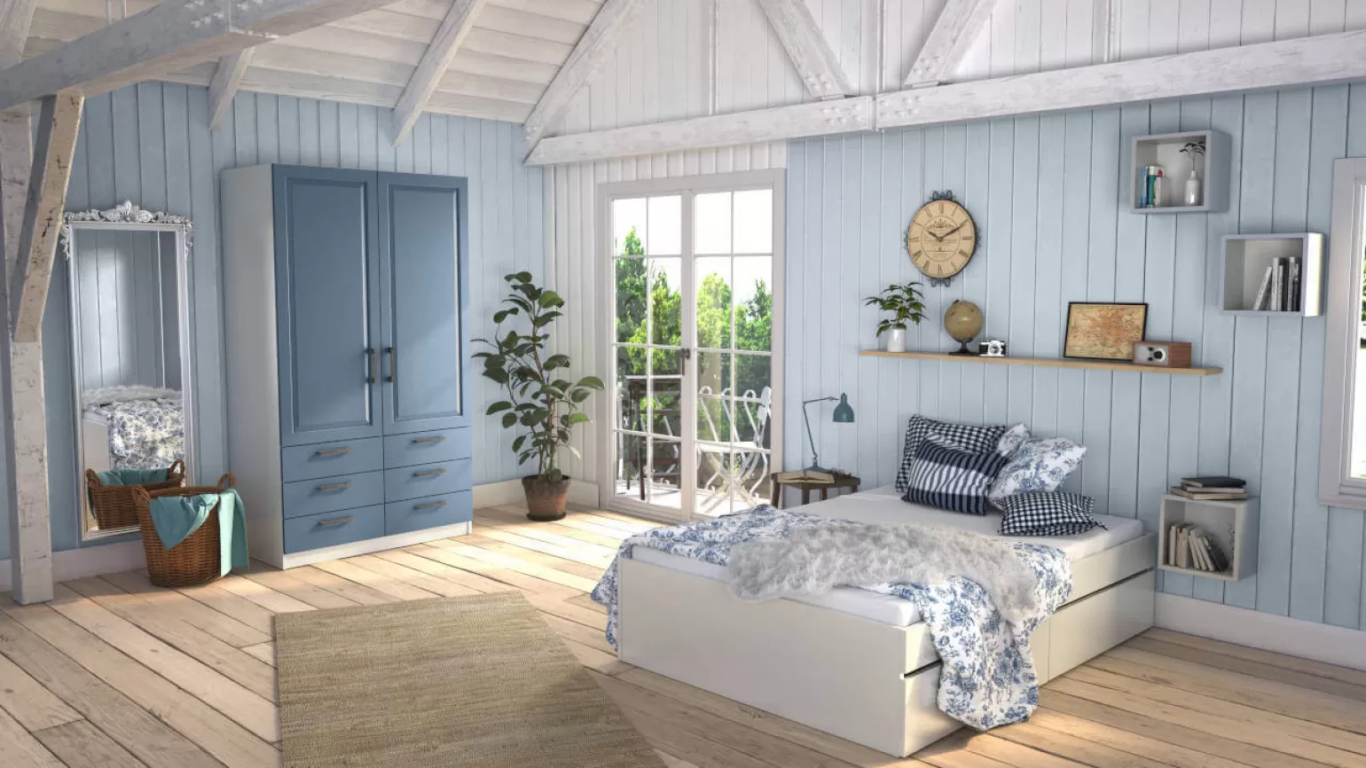 Der taubenblaue Kleiderschrank im Landhausstil kann auch in vielen anderen Farben konfiguiert werden.