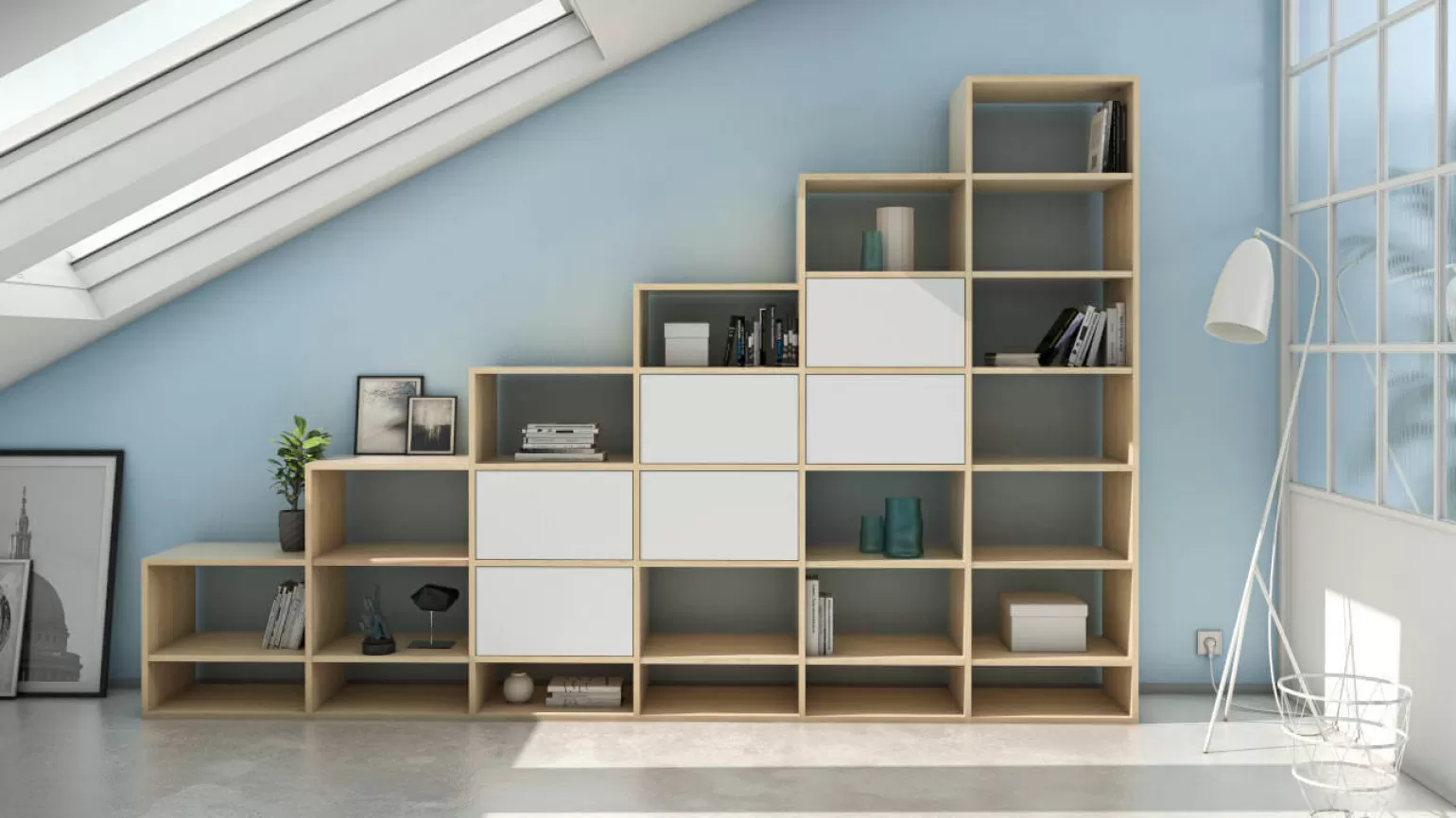 Bei besonders steilen Schrägen empfehlen sich Schränke und Regale mit stufiger Schräge. Mit stufigen Schrägen kannst du deinem Schrank oder Regal aber auch eine besondere Optik verleihen und Deko in oder auf dem Möbel in Szene setzen.