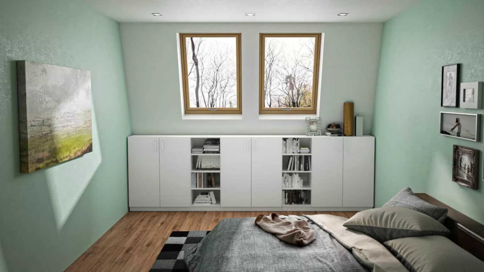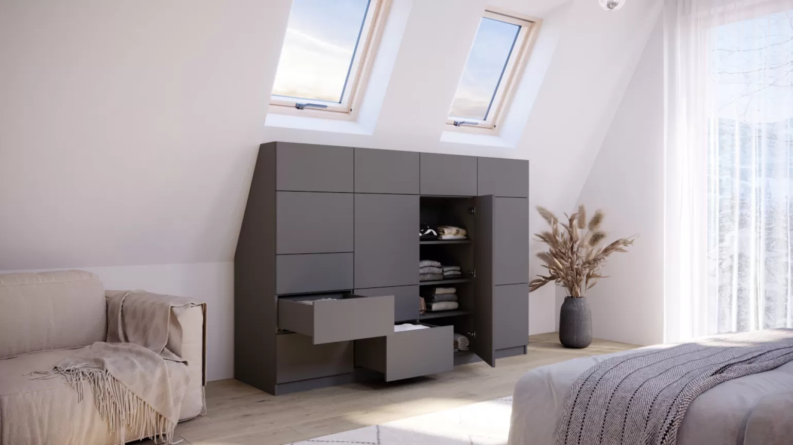 „Der Dachschrägenschrank ist ein wahres Raumwunder. Dieses Schrankmodell eignet sich besonders für räumliche Situationen, in denen normale gerade Schränke nicht passen. Dank der vielen Konfigurationsmöglichkeiten kann der Schrank optisch genau nach deinem Geschmack gestaltet werden.“