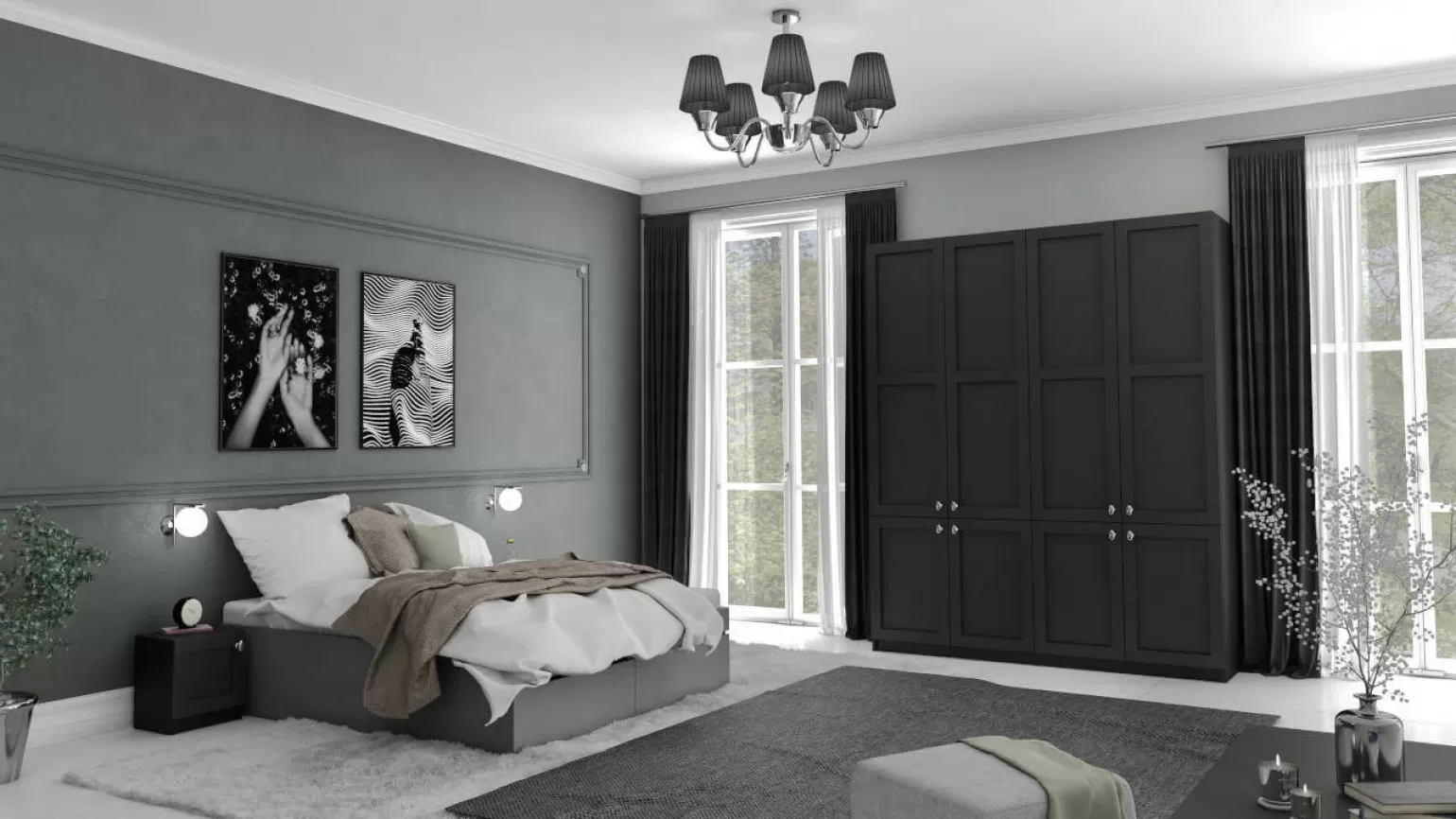 Der Kleiderschrank mit schwarzen Lackfronten und Drehtüren fügt sich dezent und passgenau an die Wand zwischen den beiden Fenstern.