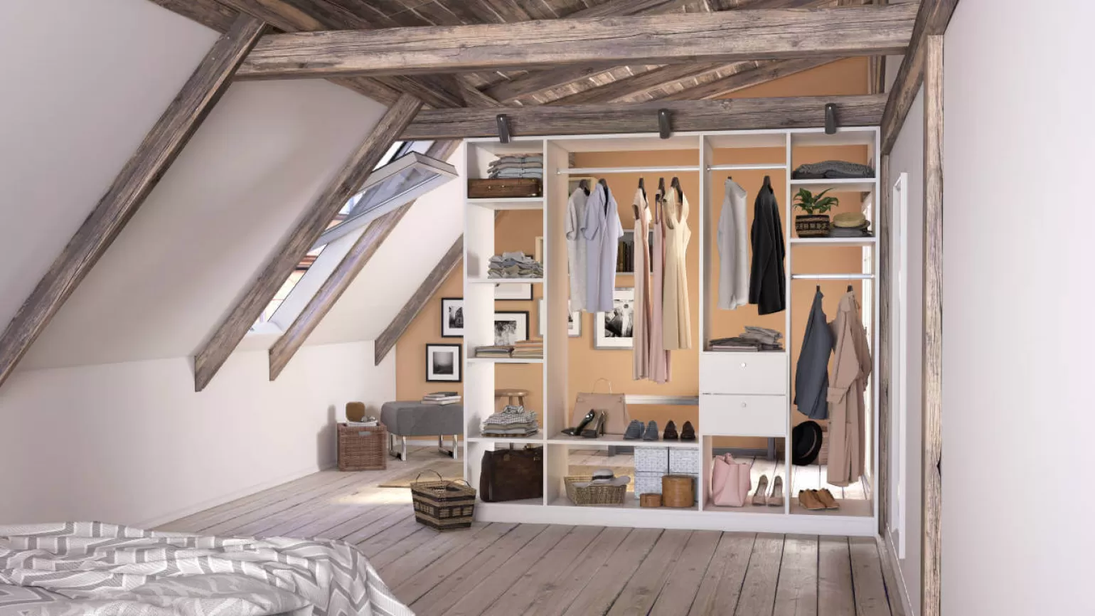 Dieser offene Schrank passt genau unter die Dachstreben und fungiert gleichzeitig als Raumteiler.