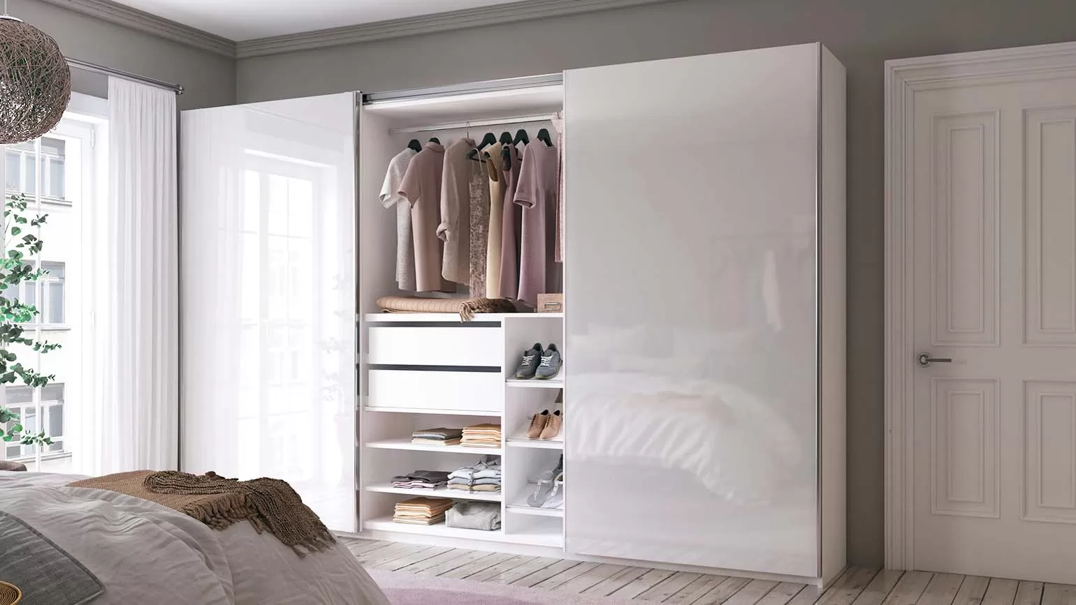 Der Schwebetürenschrank mit Lackfronten in Weiß glänzend sieht edel aus.