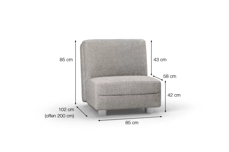 Der Schlafsessel nach Maß ist mit 85 Zentimetern deutlich schmaler als ein Schlafsofa. Falls du doch etwas mehr Platz hast, kannst du gerne direkt ein Schlafsofa nach Maß konfigurieren. Zur Auswahl stehen dir für dein Polstermöbel zum Schlafen folgende drei Kollektionen mit den jeweiligen möglichen Liegebreiten: