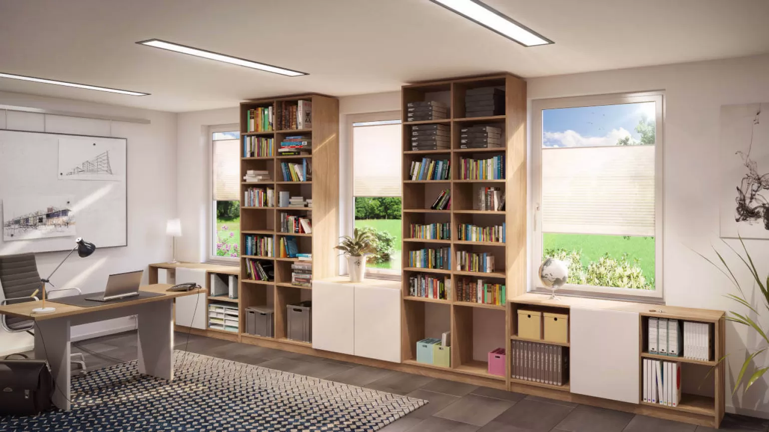 Die Aktenregale nach Maß fügen sich harmonisch in die Raumsituation ein und werden mit den Kommoden ergänzt.