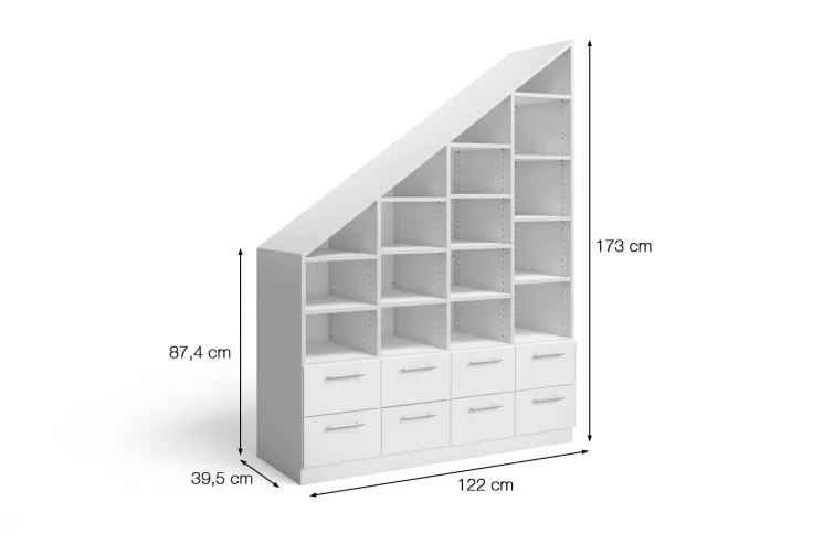 Das weiße Regal mit seitlicher Schräge passt millimetergenau unter die Treppe und verwandelt diesen Platz hervorragend in Stauraum.