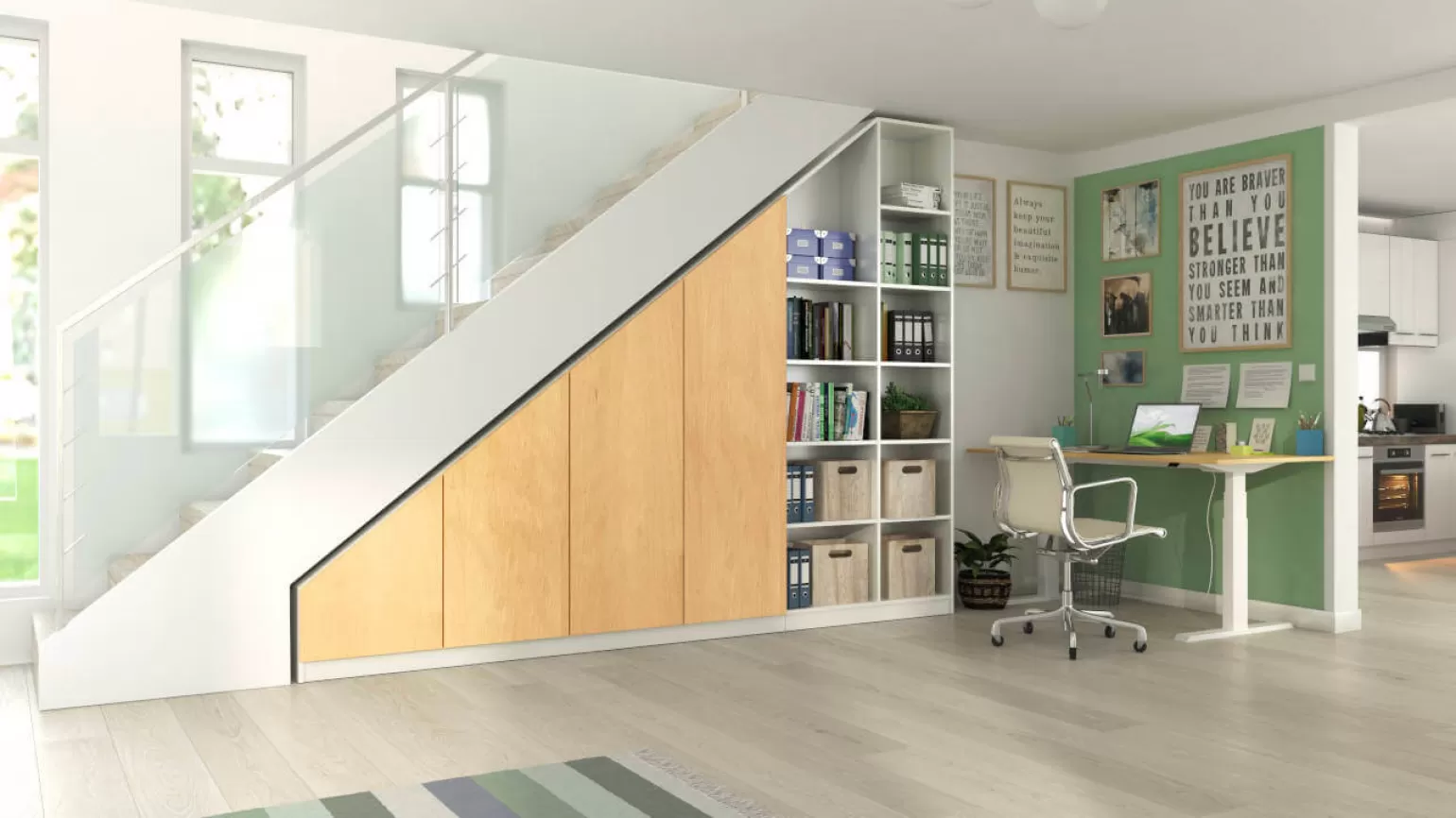 Überlege dir außerdem auch, was du in deinem neuen Treppenregal nach Maß unterbringen möchtest. Soll das Möbel seinen Platz im Eingangsbereich finden, machen zum Beispiel Kleiderstangen für Jacken und Mäntel Sinn oder auch Schuheinlegeböden für Sneaker, Stiefel und Sandalen. Befindet sich die Treppe hingegen in deinem Arbeitszimmer und führt nach oben in den ausgebauten Dachboden, dann ist viel Platz für Aktenordner, Bücher und Büromaterialien notwendig. Konfiguriere das Treppenregal deshalb mit vielen offenen und flexiblen Regalfächern und füge auch ein paar Schubladen ein, damit du Kleinkram gut verstauen kannst.